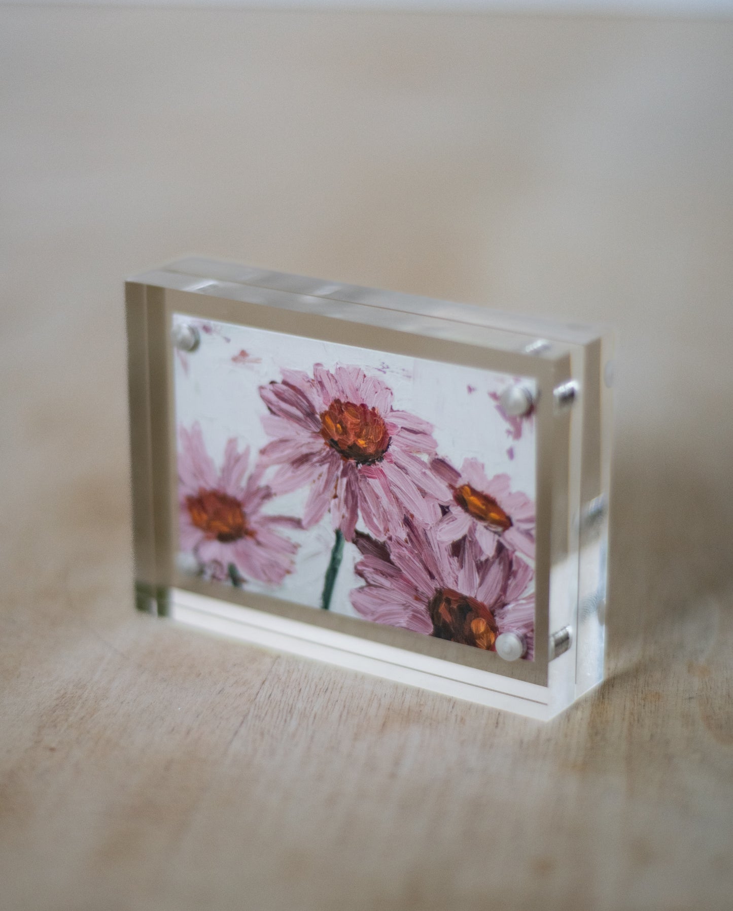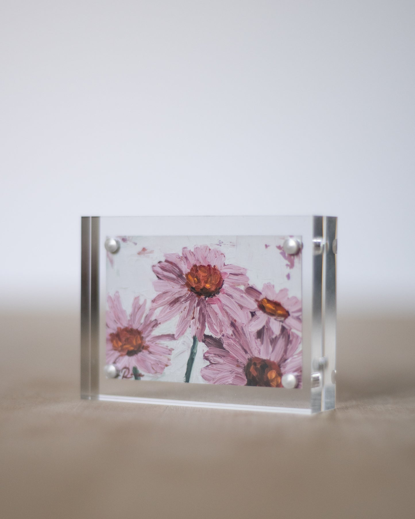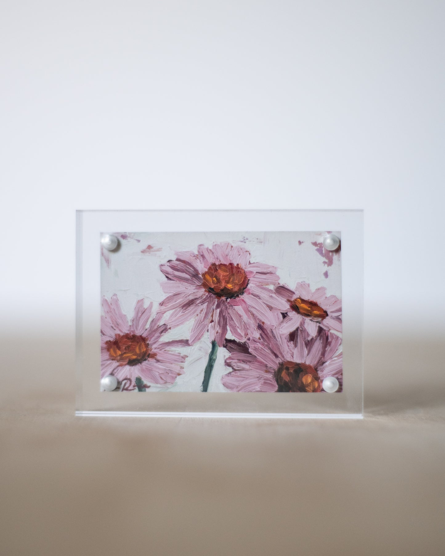 We are excited to now be offering a limited amount of mini prints! These are not printed on demand so once they run out of stock, they may not restock for a while. Make sure to snag your favorites while they're still available! The mini prints are 2x3" and can be purchased with or without a mini acrylic frame. These mini prints in our acrylic frame are so versatile and are the perfect touch to brighten up any space. Display them on your nightstand or desk at work to add a artistic pop to your space.