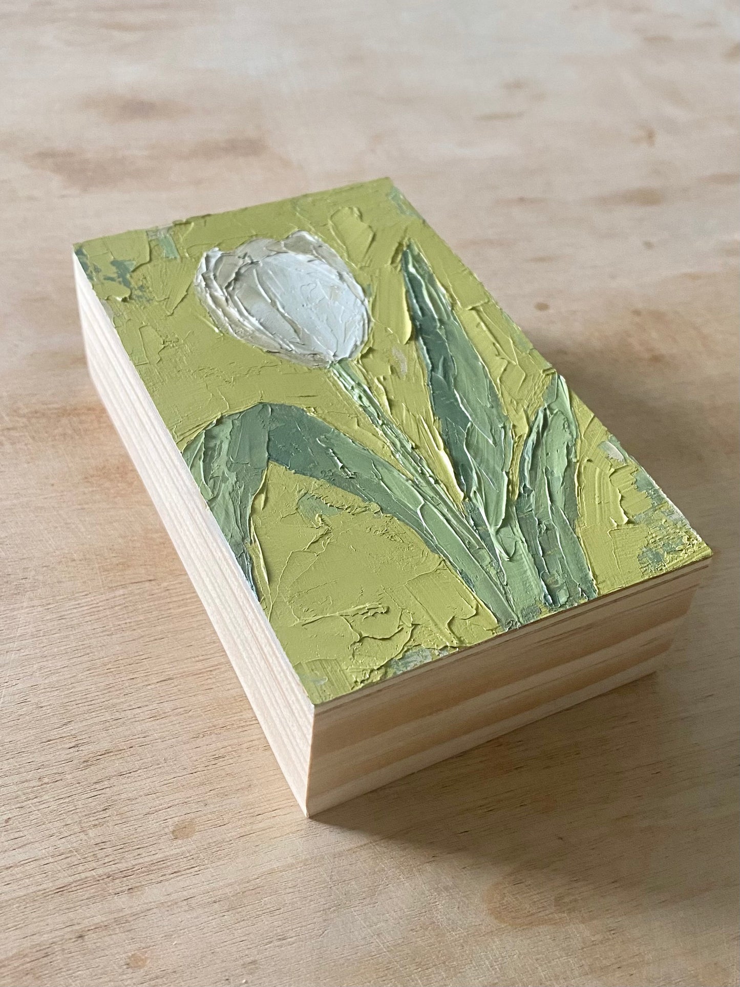 Painted on cradled birch wood panel with natural wood sides. No frame included. The painting can be displayed as is standing on any flat surface. Hanging hardware is not installed or included.