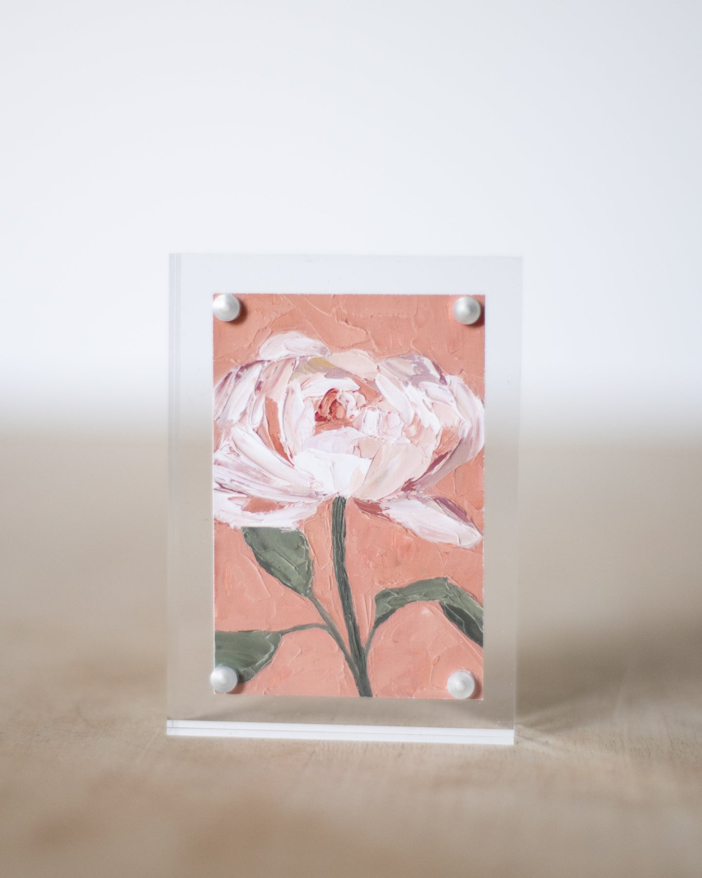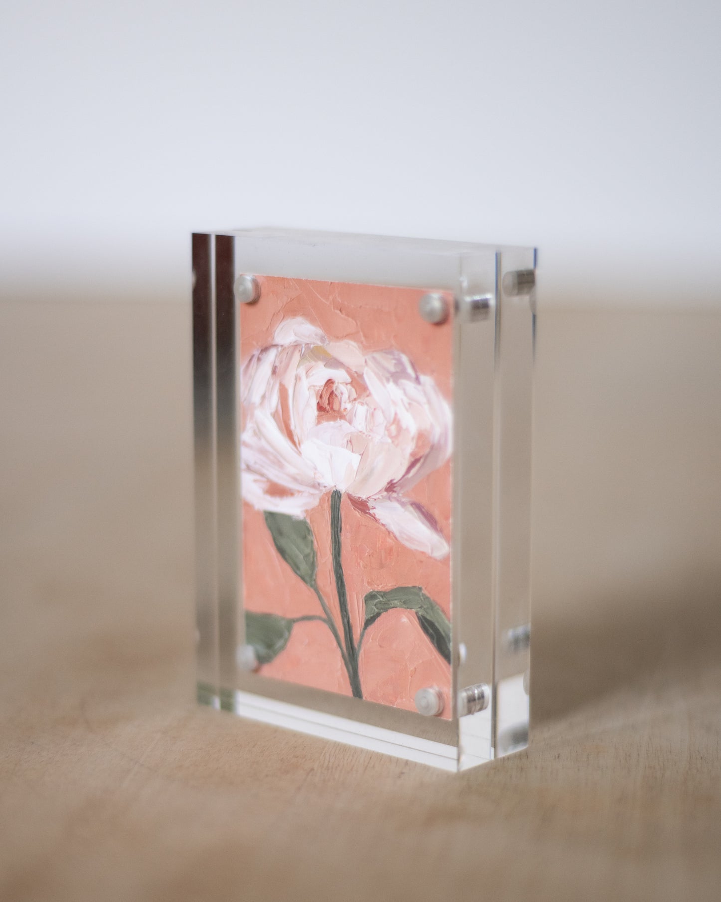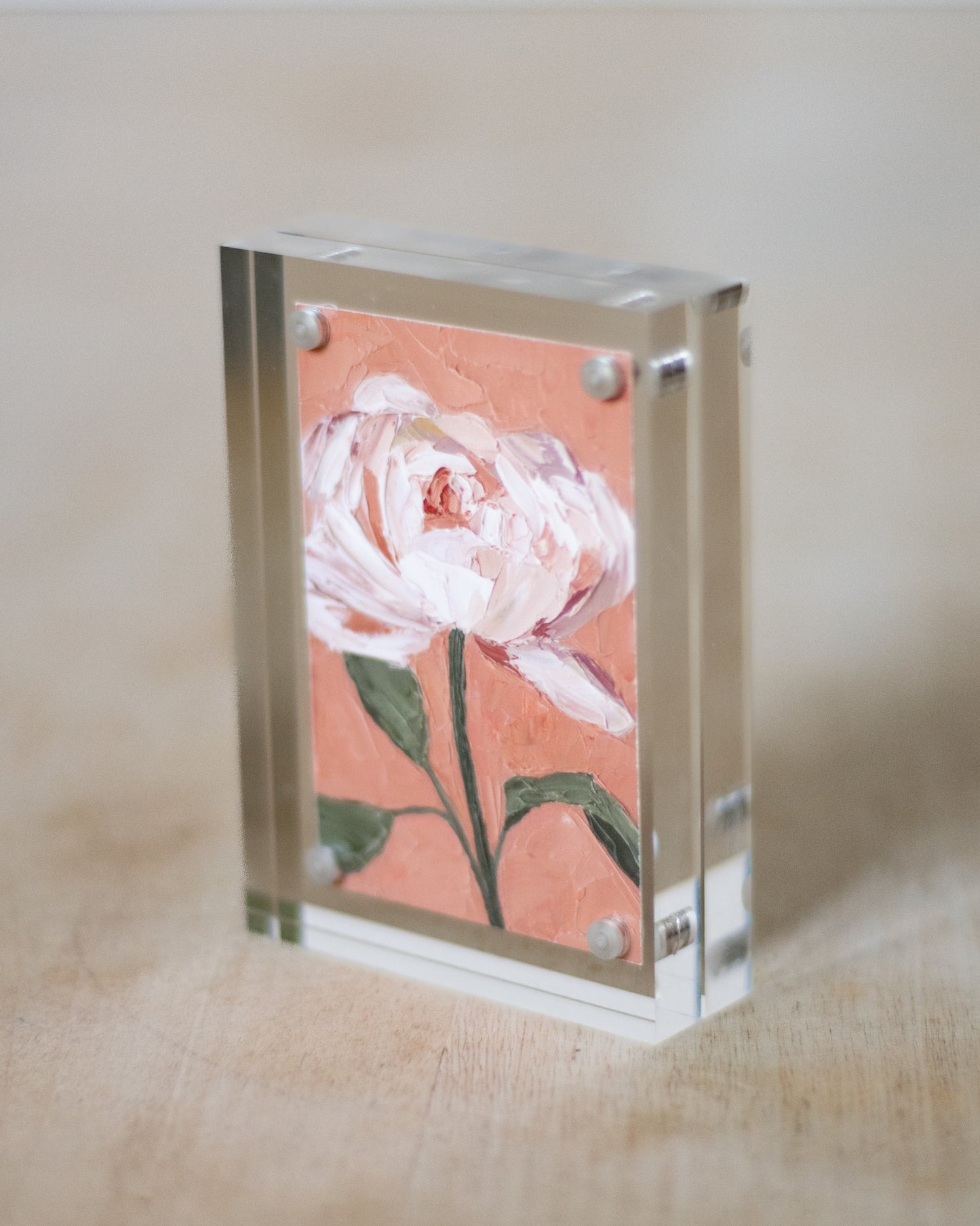 The mini prints are 2x3" and can be purchased with or without a mini acrylic frame, shown in the pictures above. These mini prints in our acrylic frame are so versatile and are the perfect touch to brighten up any space. Display them on your nightstand or desk at work to add a artistic pop to your space.