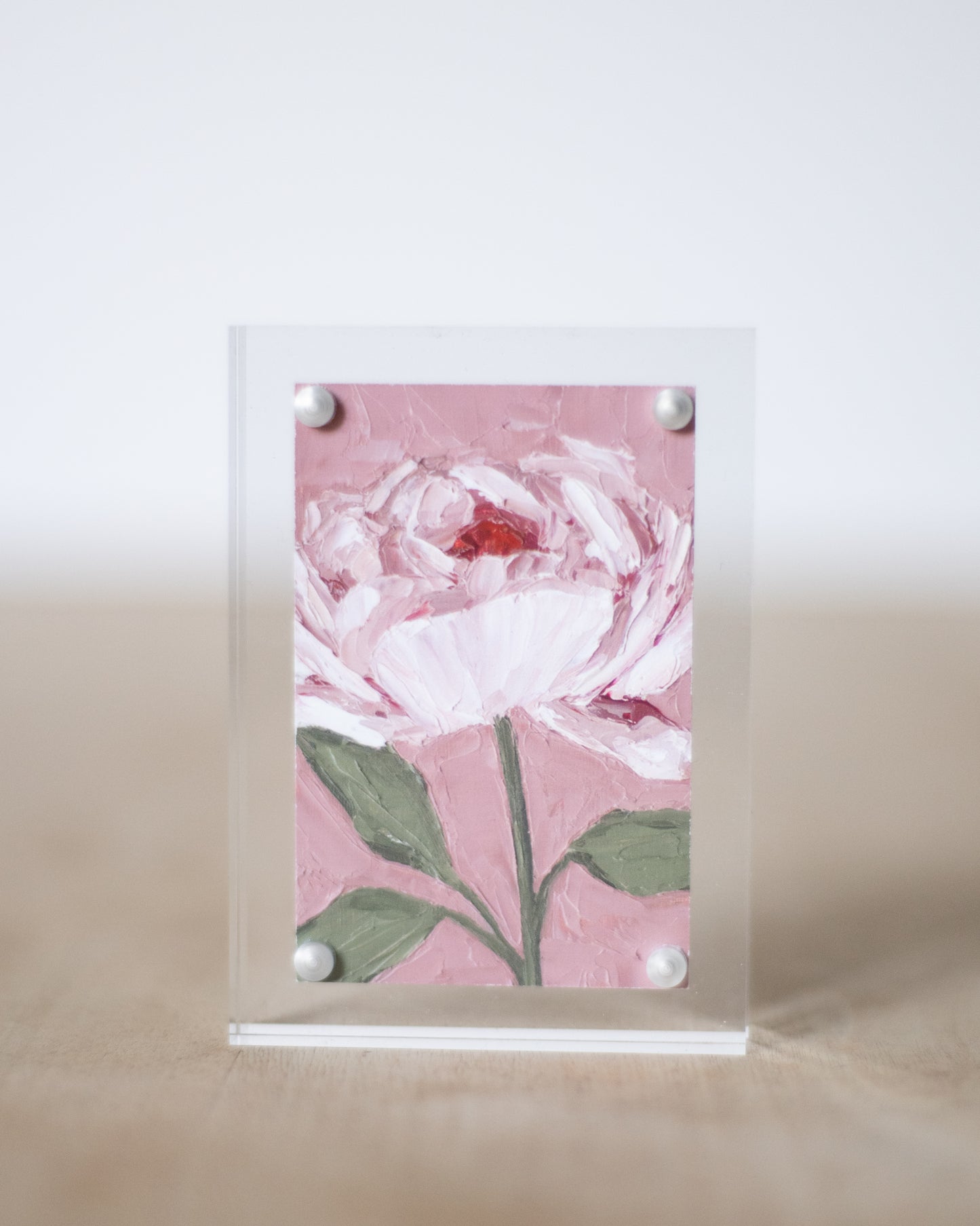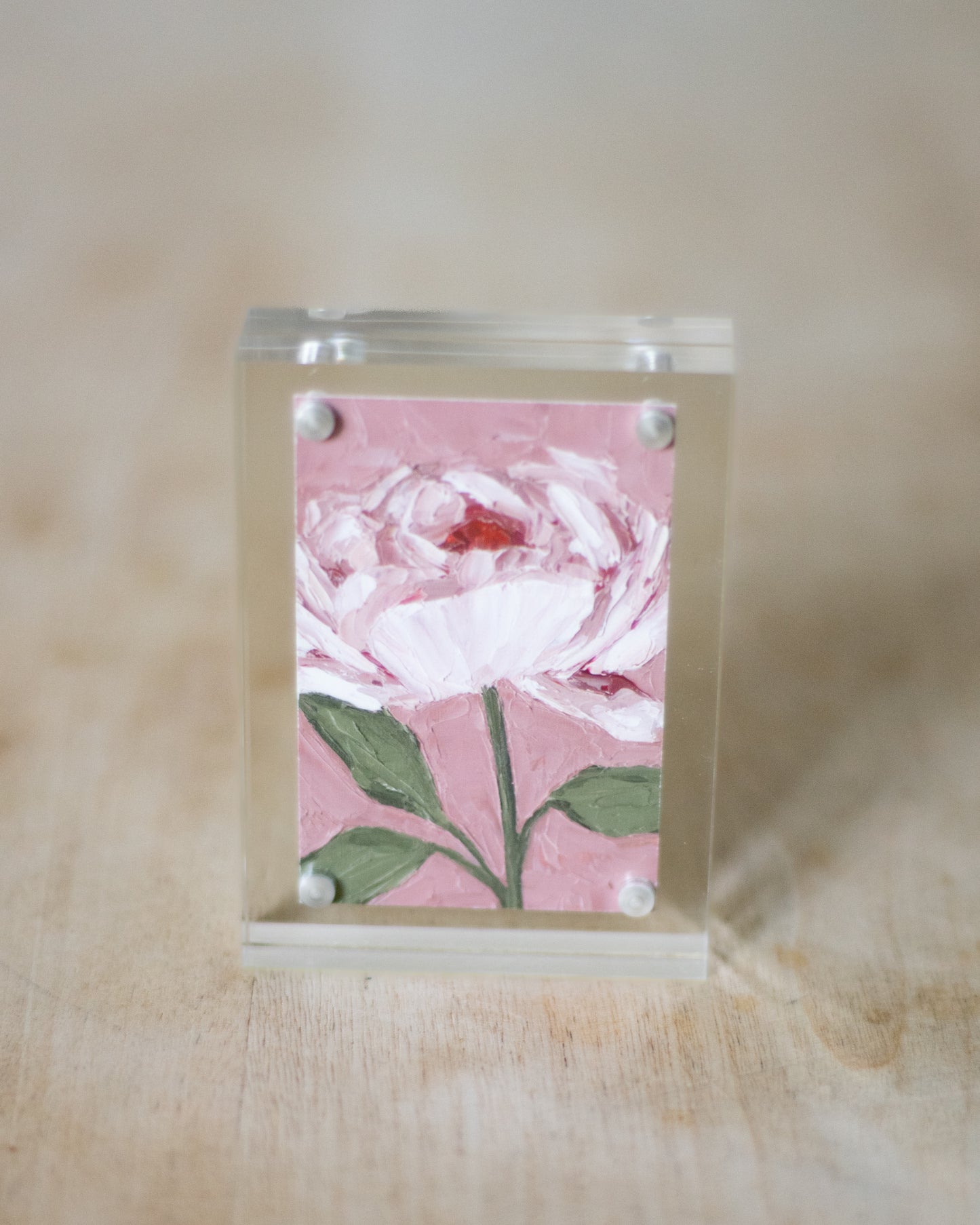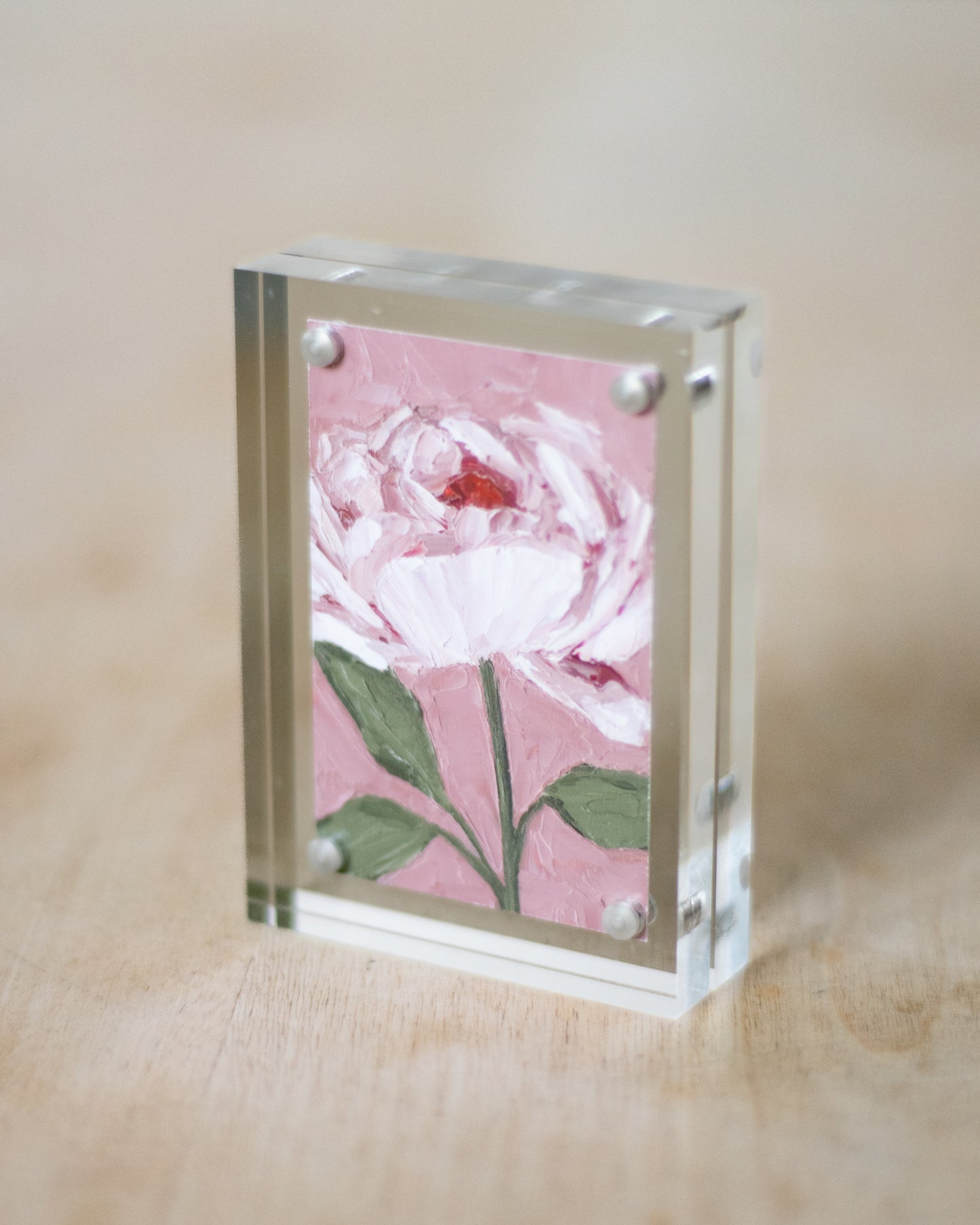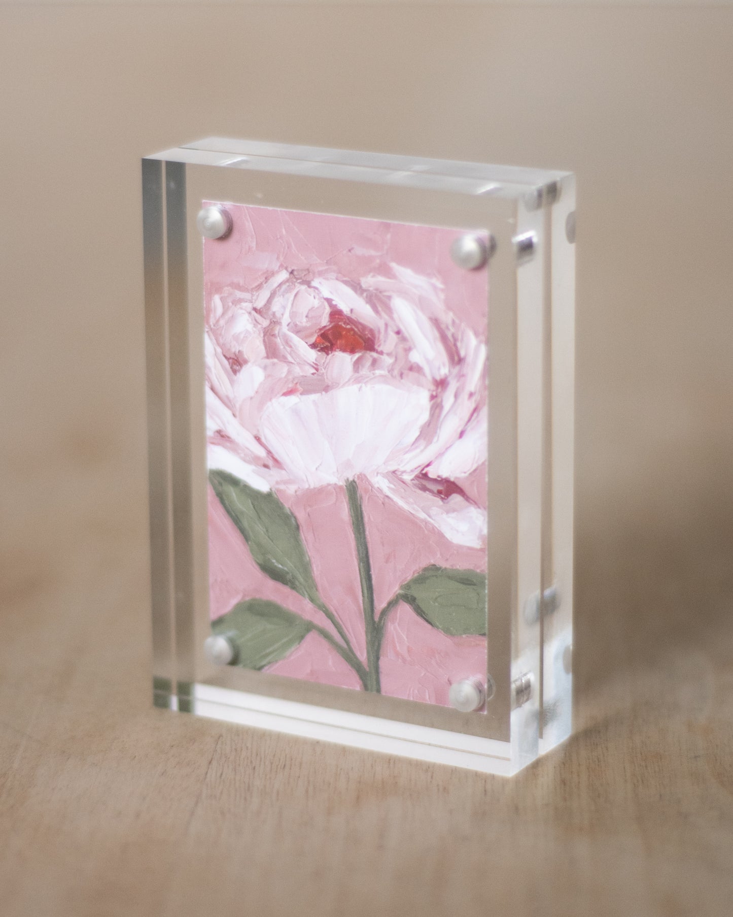 The mini prints are 2x3" and can be purchased with or without a mini acrylic frame, shown in the pictures above. These mini prints in our acrylic frame are so versatile and are the perfect touch to brighten up any space. Display them on your nightstand or desk at work to add a artistic pop to your space.