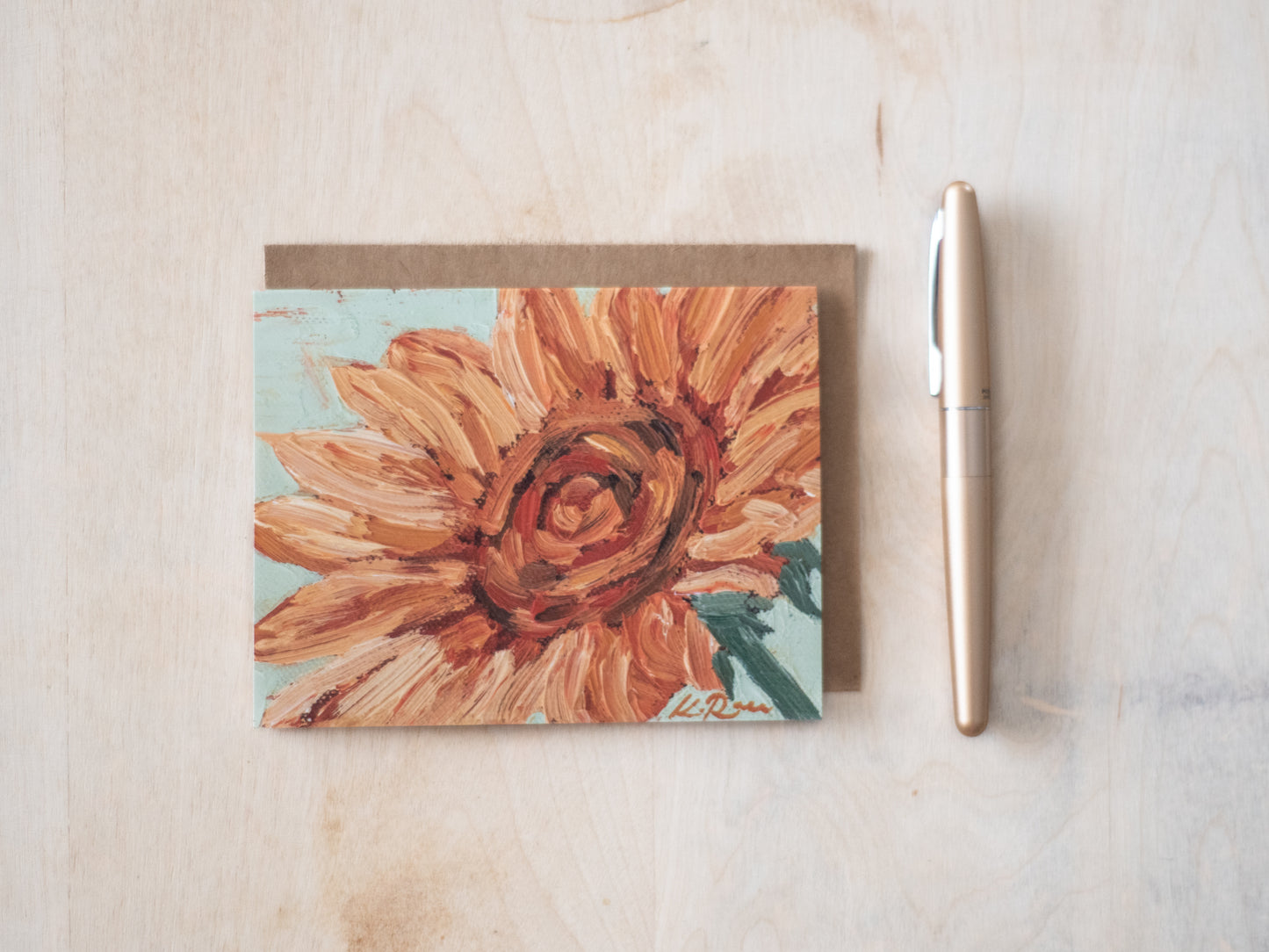 Sunflower notecard of an original painting by Katelynne Rose. Each card comes with an envelope packaged in a protective sleeve. The cards are blank inside so you can write your message of choice. They can be used for Mother's Day, Birthday's, thank you notes, teacher appreciation and so much more! Each card is a print of an original oil painting created by Katelynne Rose. Every card is printed, cut, folded and packed by me. My goal is to provide the highest quality cards that you are excited to gift to your loved ones. We use heavy weight photo matte stock, to ensure quality images and give stability to the card. If you like to get more bang for your buck, you can cut the card in half and frame the image on the front of the card! The card has the same quality as a fine art print! Due to the size of the card, I suggest framing it in a floater frame that can accommodate irregular sized image.